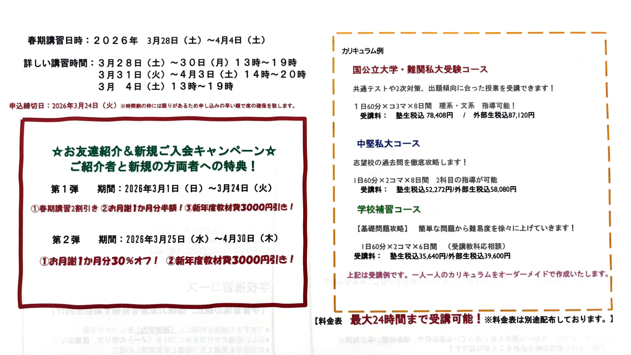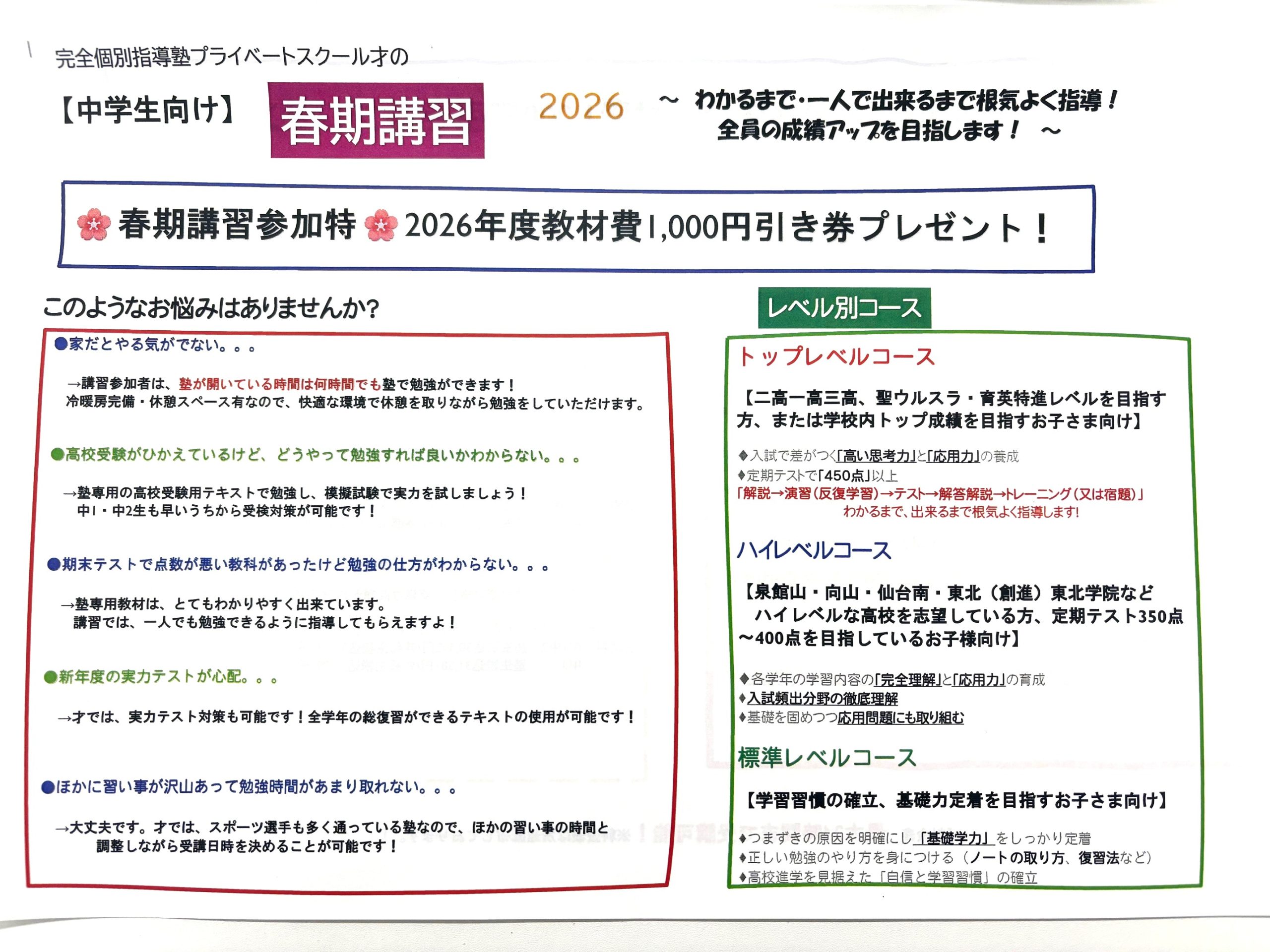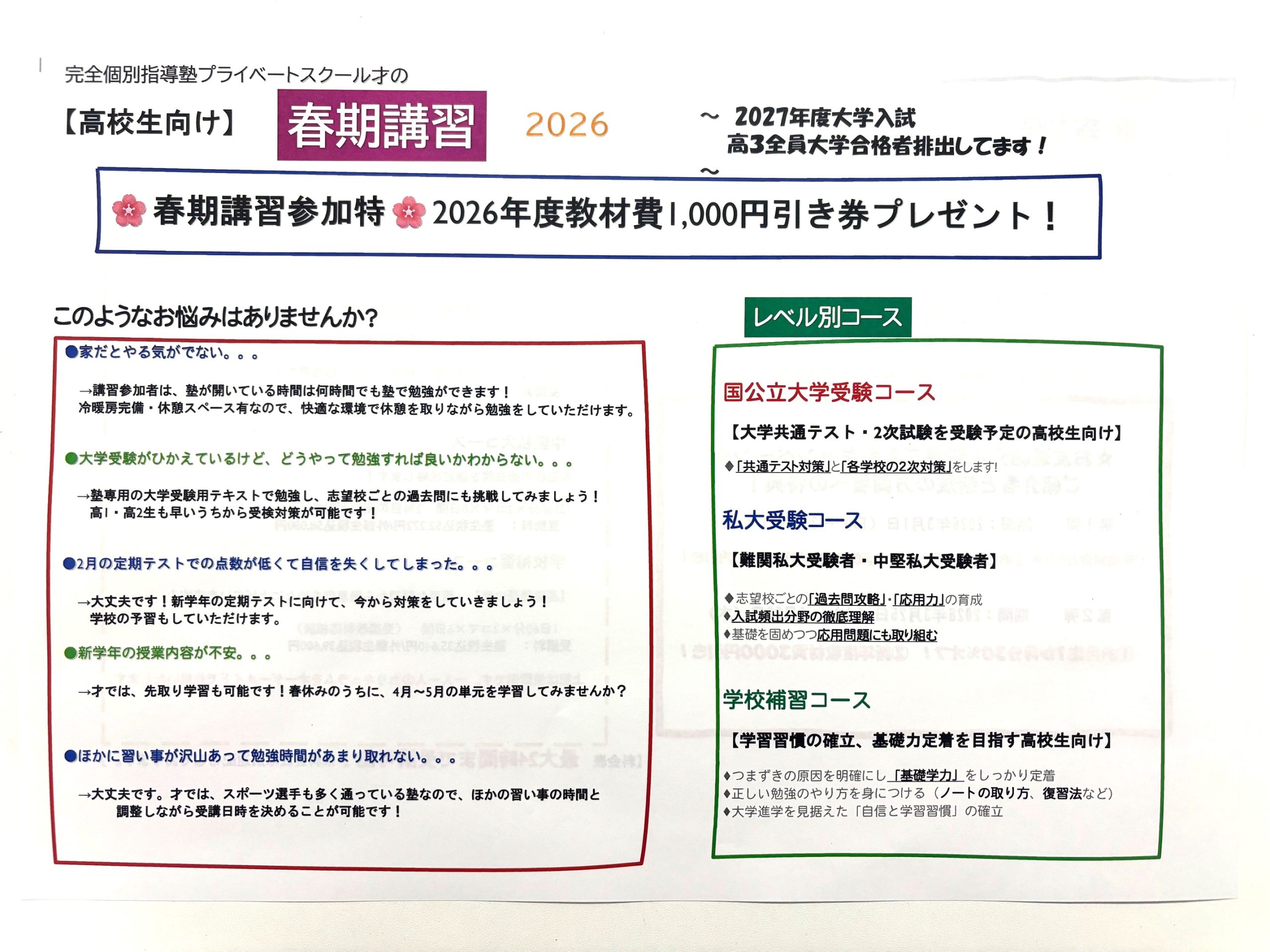 2026年度春期講習受付中!キャンペーンも実施中! トップページ 新着情報 2026年度春期講習受付中!キャンペーンも実施中! 春期講習受付中!春のご入会キャンペーンも実施! 高校生はこちら↓ ← 新規割引あり!冬期講習受付中!寒い冬を才で暖か~く!